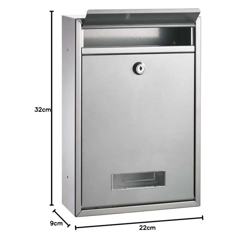 Briefkasten∙ Mit Klarsichtfenster und Halter für Namensschild ∙ Aus Stahlblech, silbern lackiert ∙ Mit Drehzylinderschloss und 2 Schlüsseln ∙ Inklusive Befestigungsmaterial