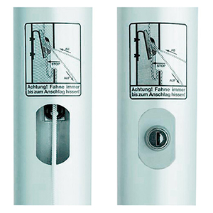 · Zylindrisches Profil · Innenliegende Hissvorrichtung mit Sicherheits-Seilklemme · Vertikale Fahnentuchführung durch Gurtschlaufen am Mast · Leichte Hissbarkeit durch Doppelrollenführung im Mastkopf · Gewichtspack gegen Hochwehen der Fahne am Mast und für leichtes Einholen · Mastbeschläge aus hochwertigem Kunststoff