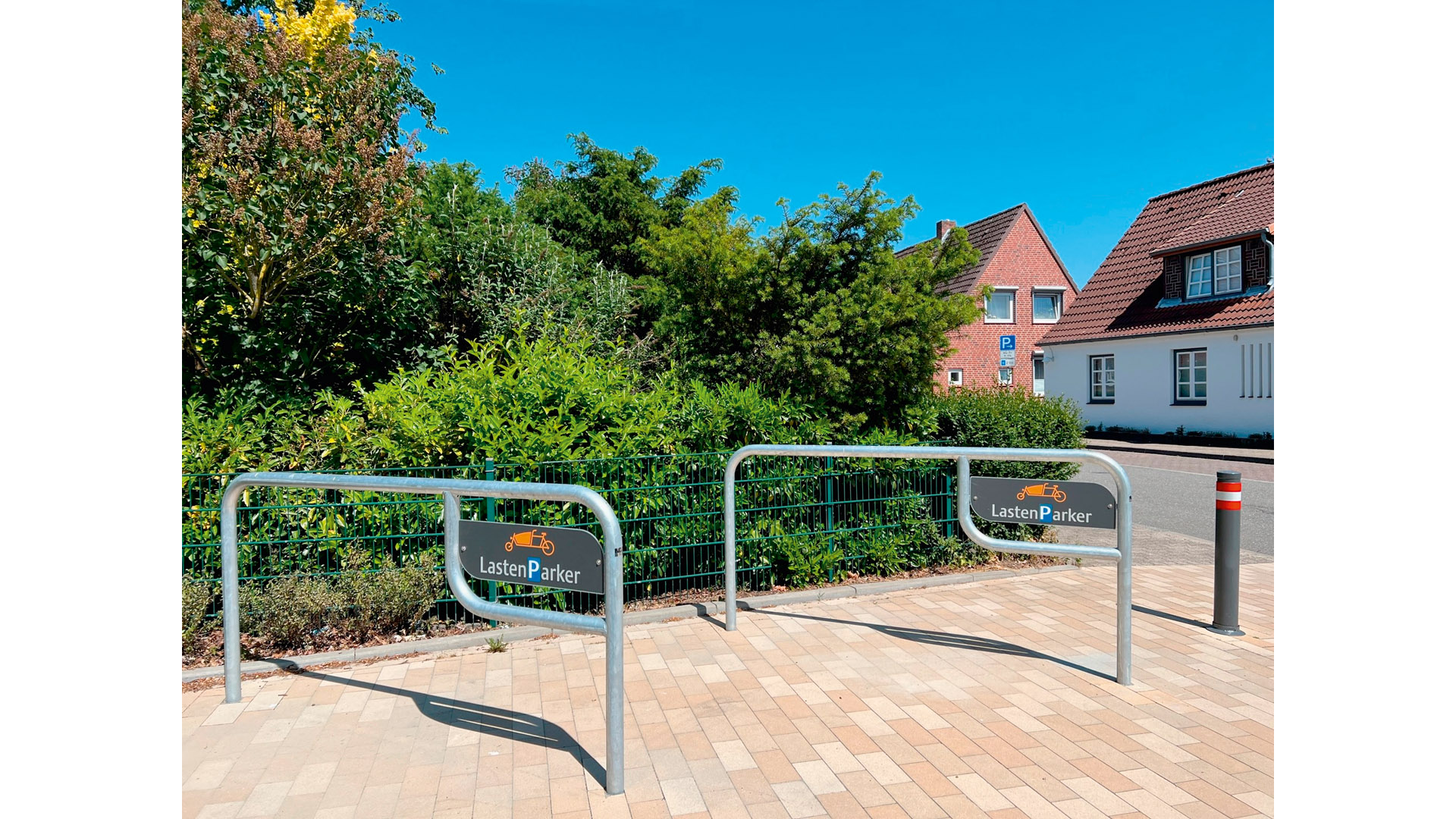 Fahrradbügel, Anlehnbügel für Lastenfahrräder, Stahlrohr D 60 mm, verzinkt, zum Einbetonieren, ohne Schild, B x H 2100 x 1060 mm