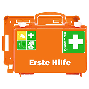 Ausführung: Komplett mit Füllung nach DIN 13157 ∙ Staubdicht und spritzwassergeschützt ∙ Koffer aus schlagfestem ABS-Kunststoff in Signalfarbe ∙ Siebdruckbeschriftung und Farbpiktogramme ∙ Inneneinteilung verstellbar, transparente Abdeckplatten ∙ Praktisc