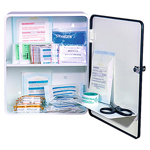 302 x 362 x 140 mm ∙ Stahlblech, weiß lackiert ∙ Eintürig, verschließbar ∙ 1 Einlegeboden ∙ Siebdruck und Piktogramme ∙ Komplett mit Füllung DIN 13157 ∙ Zusätzlich klappbares Ablagetableau zur hygienischen Zwischenlagerung von Verbandmaterial bei der Erste-Hilfe-Leistung