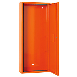 Robuste Schränke aus Qualitäts-Feinblech in Signalfarbe Orange ∙ Staubdicht und spritzwassergeschützt ∙ Siebdruckbeschriftung und Farbpiktogramme ∙ Sicherheits-Zylinderschloss mit 2 Schlüsseln ∙ Notschlüsselfach in der Türmitte im Feuermelderprinzip