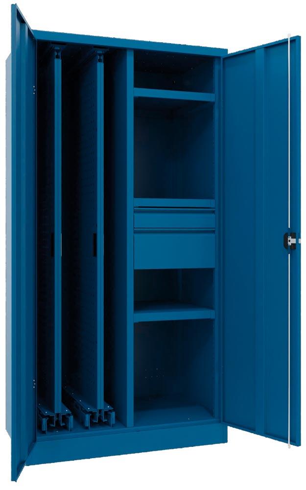 Vertikalauszugschrank, 2 Auszüge mit Lochplatten, Mitteltrennwand, 3 Böden, 2 Schubladen (1x100 mm, 1x200 mm), BxTxH 1000x600x1950 mm, RAL 5010