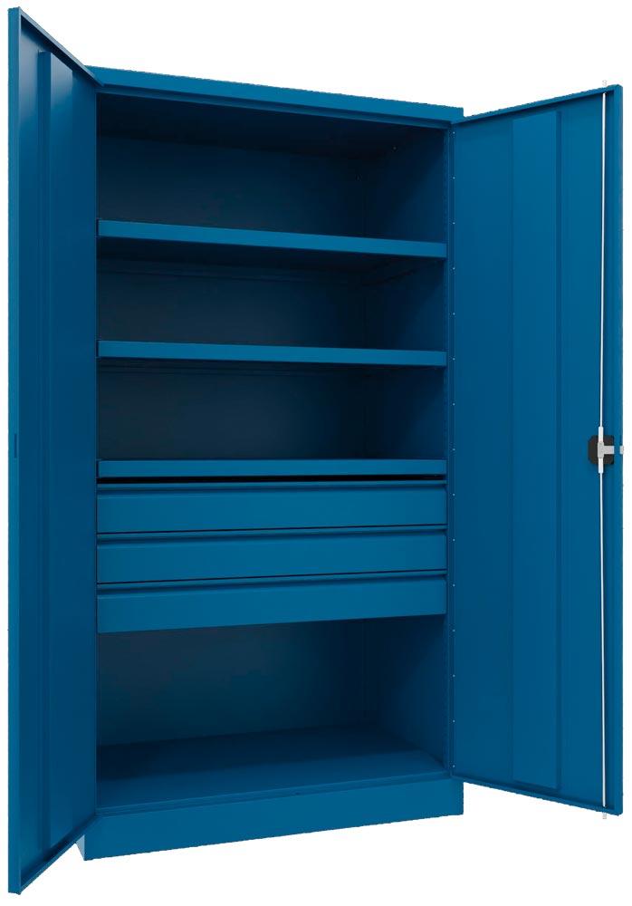 Produktinformationen "Schwerlastschrank, Vollblechtüren, ohne Trennwand, 3 Böden, 200 kg Traglast, 3 Schubl. 125 mm, BxTxH 1040x630x1950 mm, RAL 5010"