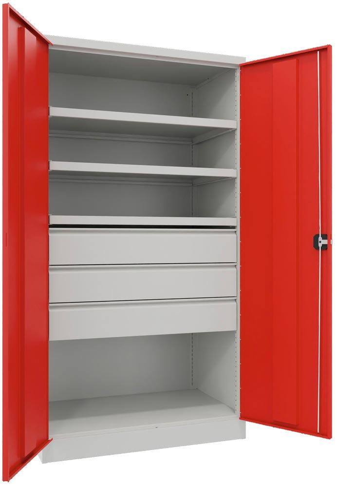 Produktinformationen "Schwerlastschrank, Vollblechtüren, ohne Trennwand, 3 Böden, 200 kg Traglast, 3 Schubl. 175 mm, BxTxH 1040x630x1950 mm, RAL 7035/3000"