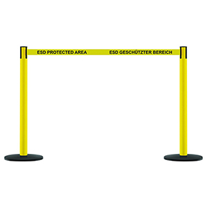 Produktinformationen "Gurtpfosten, Rollgurtpfosten, Modell ESD, Pfosten Gelb, Höhe 0,973 m, 2,3 m Gurtband gelb zweisprachig + beids. bedruckt, 4-Wege System, Gurtbremse, Sicherungsclip"