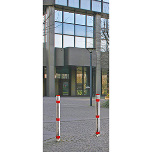 Sperrpfosten aus Stahl, rund Durchm. 76 mm, mit 3 roten Ringen, herausnehmbar aus Bodenhalterung, mit Dreikant-Feuerwehrverschluss