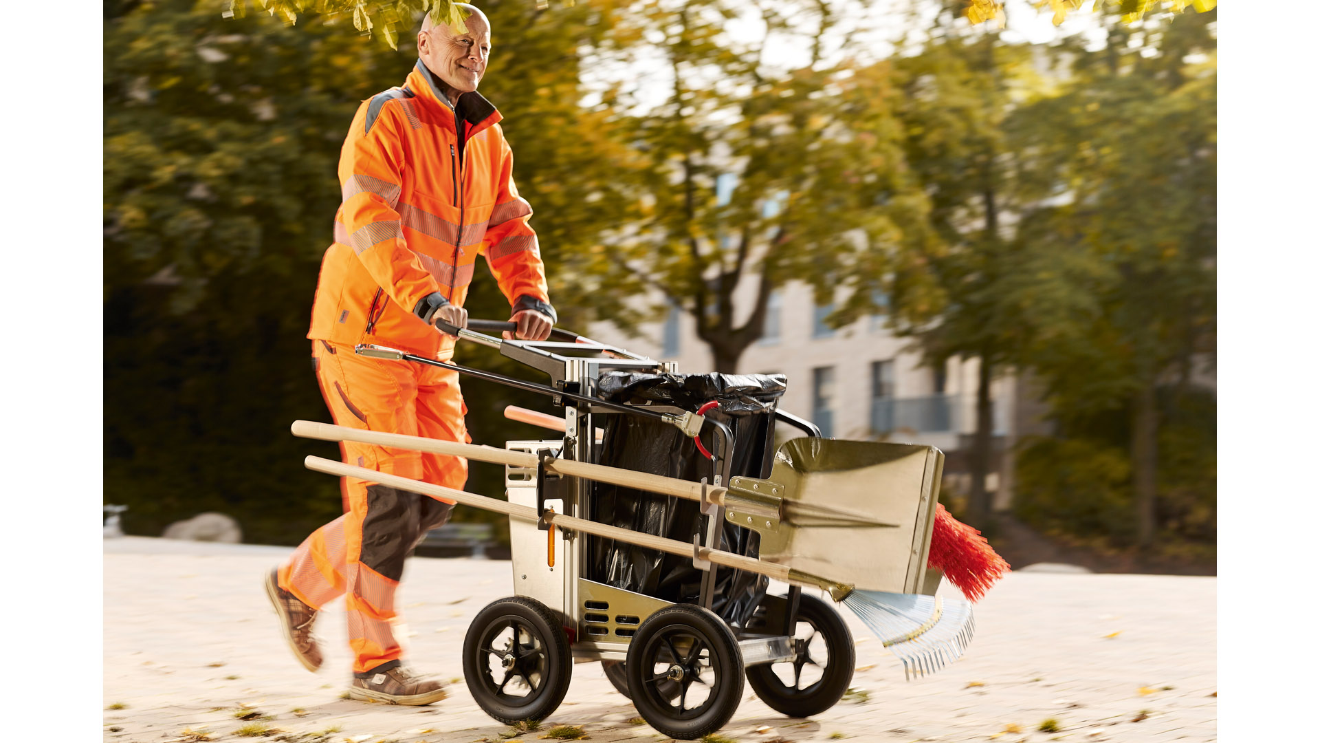 · Aus Aluminium, pulverbeschichteter Profilrahmen aus verzinktem Stahl · Zwei Achsen und große pannensichere Räder · Feststellbremse · Inklusive Müllsackhalterung, Aluminiumschaufel, Straßenbesen und passenden Stielen · Für die kommunale Außenreinigung und den professionellen Einsatz · Waagerechte Halterung von bis zu vier Stielgeräten mit bequemem Zugang, eine senkrechte Stieltasche · Abschließbares Handfach mit offener Ablage · Höhenverstellbarer Griff
