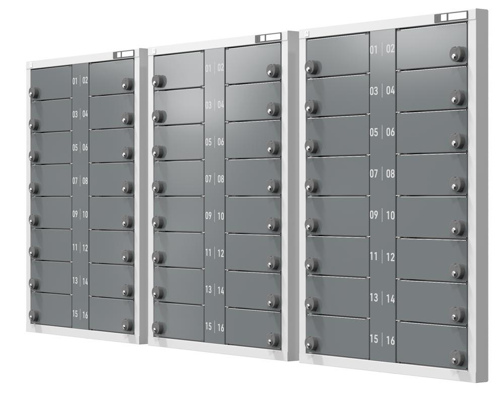 Ladeboxen für Tablets, 8 Fächer, 3 Anschlüsse, BxTxH 1182x57x1155 mm, 55 kg, Korpus RAL 7035, Türen RAL 5012