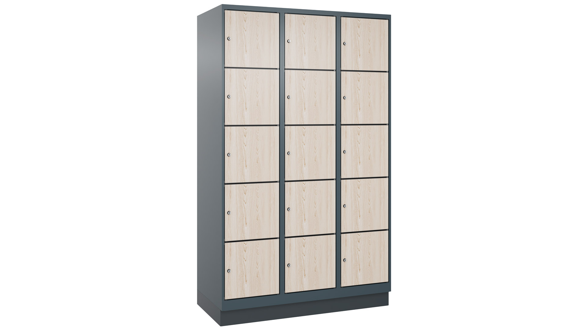 Fächerschrank mit MDF Türen, BxTxH 900x500x1950 mm, 3x5 Fächer, Abt.B 300 mm, Sockel, Schloss, HPL-Dekorfront, RAL 7016/Dekor Ahorn