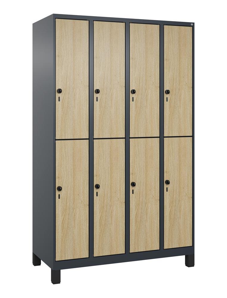 Fächerschrank, doppelstöckig, Füße, 4x2 Fächer, Abt.B 300 mm, BxTxH 1200x500x1950 mm, HPL-Dekorfront, RAL 7016/Dekor Eiche Sereno