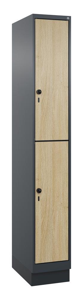 Fächerschrank, doppelstöckig, Sockel, 1x2 Fächer, Abt.B 300 mm, BxTxH 300x500x1950 mm, HPL-Dekorfront, RAL 7016/Dekor Eiche Sereno