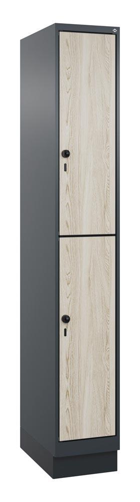 Fächerschrank, doppelstöckig, Sockel, 1x2 Fächer, Abt.B 300 mm, BxTxH 300x500x1950 mm, HPL-Dekorfront, RAL 7016/Dekor Sen Esche