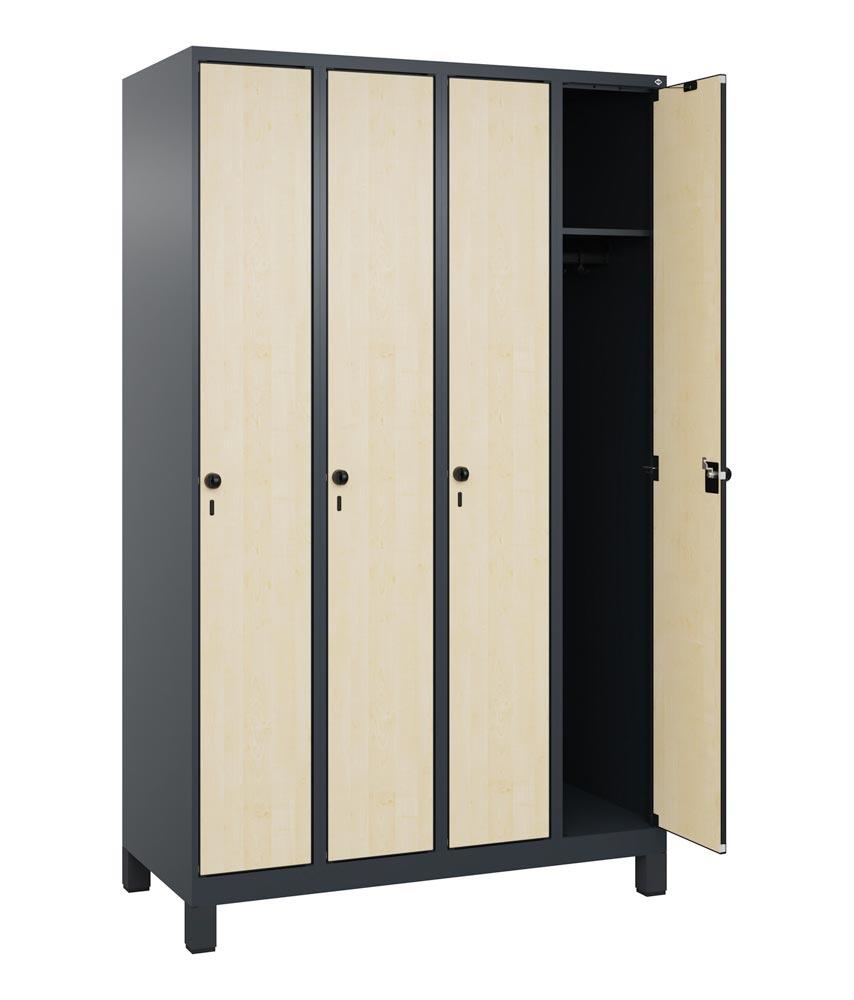 Produktinformationen "Garderobenschrank, Füße, 4 Abt., Abt.B 300 mm, BxTxH 1200x500x1950 mm, HPL-Dekorfront, RAL 7016/Dekor Ahorn"