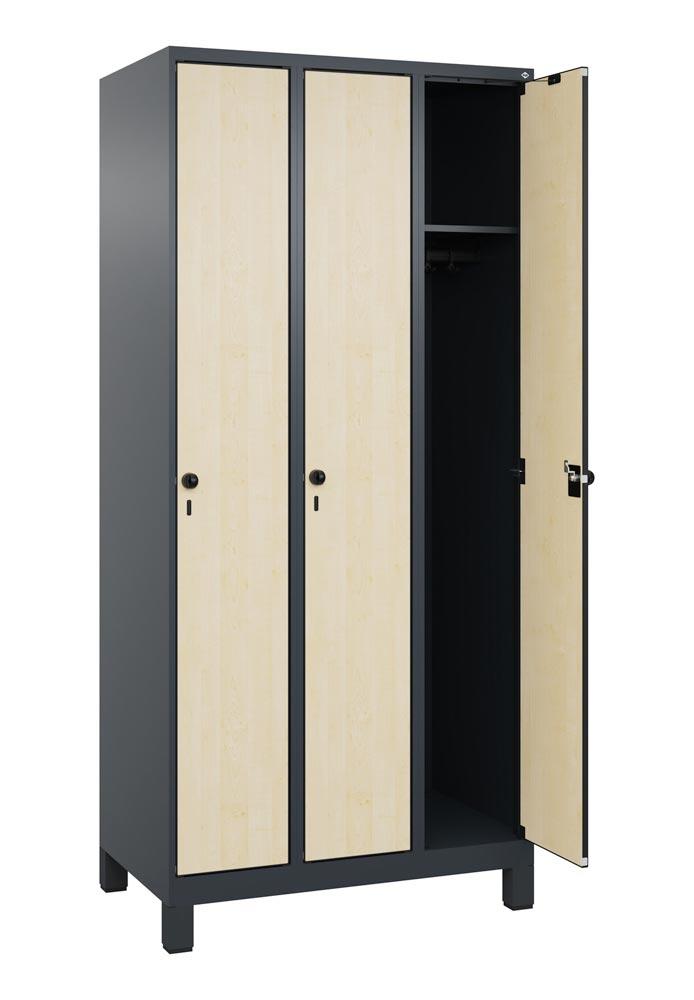 Produktinformationen "Garderobenschrank, Füße, 4 Abt., Abt.B 300 mm, BxTxH 1200x500x1950 mm, HPL-Dekorfront, RAL 7016/Eiche-Sereno"