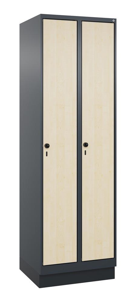 Produktinformationen "Garderobenschrank, Sockel, 2 Abt., Abt.B 300 mm, BxTxH 600x500x1950 mm, HPL-Dekorfront, RAL 7016/Dekor Ahorn"