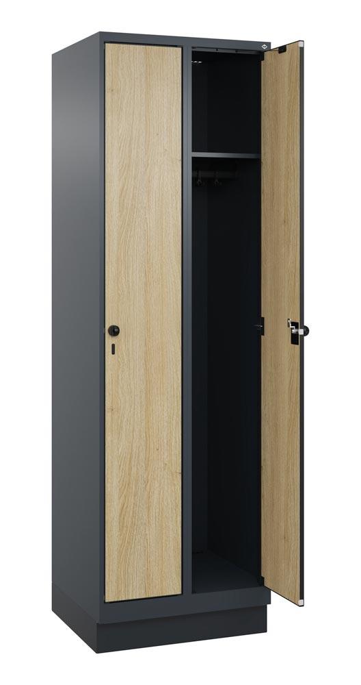 Produktinformationen "Garderobenschrank, Sockel, 2 Abt., Abt.B 300 mm, BxTxH 600x500x1950 mm, HPL-Dekorfront, RAL 7016/Dekor Eiche-Sereno"