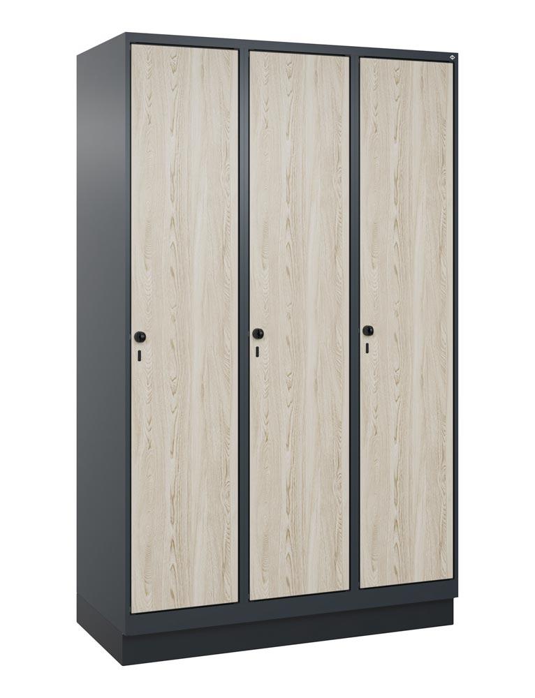 Produktinformationen "Garderobenschrank, Sockel, 3 Abt., Abt.B 400 mm, BxTxH 1200x500x1950 mm, HPL-Dekorfront, RAL 7016/Dekor Sen-Esche"