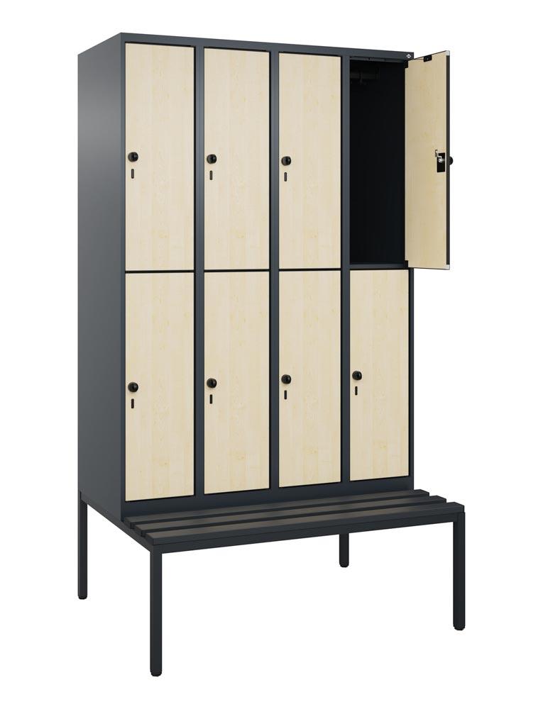 Garderobenschrank mit Sitzbank, BxTxH 800x500/815x2120 mm, 2x2 Fächer, Abt.B 400 mm, doppelstöckig, Kunststoffleisten, RAL 7016/Eiche
