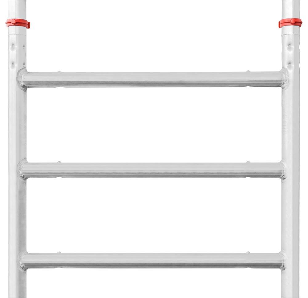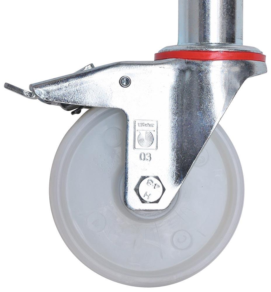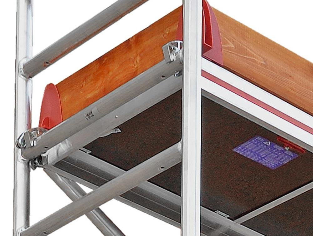 · Kompakt und Platzsparend · Äußerst stabil · Mit großer Arbeitsbühne L x B 1900 x 600 mm · Aufbau optional mit Höhenversatz z. B. in Treppenstellung · Zulässige Belastung 200 kg/m2 · 4 Lenkrollen Ø 125 mm (ab Größe Ø 150 mm) · Nach EN 1004