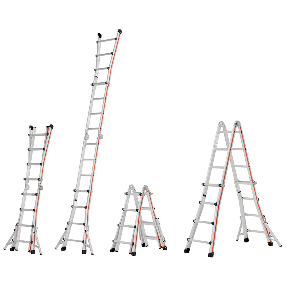 ∙ Vielseitig verwendbar als Anlege- oder Stehleiter ∙ Leiter in 250-mm-Schritten höhenverstellbar ∙ Mit ausklappbaren Auslegern für höhere Standsicherheit (erfüllt EN 131-1) ∙ Ergonomische und wartungsfreundliche Bolzengelenke ∙ In Stehleiterposition kann die Leiter zum Versetzen zusammengeklappt werden ohne vorher das Gelenk zu lösen ∙ Sperrelemente aus Alu-Guss für Höhenverstellung ∙ Aufbau in Treppenstellung möglich ∙ Geringer Platzbedarf bei Lagerung und Transport · Hinweis: Gelenke müssen sauber gehalten und regelmäßig geschmiert werden ∙ Verwendbar als: Stehleiter