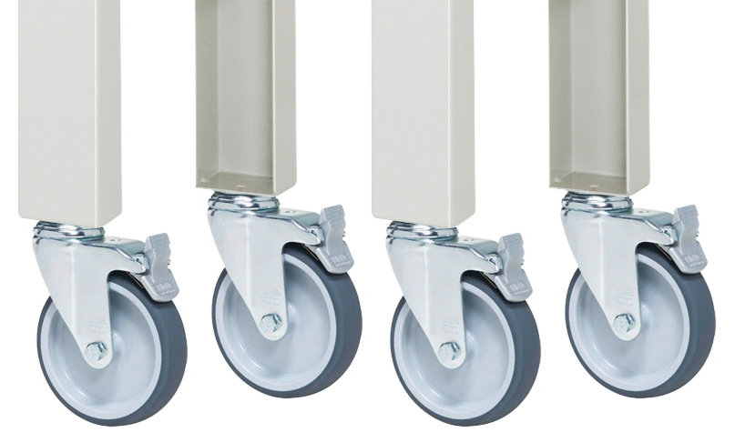 - 4-Fuß Gestell mit zwei Gestellfußpaaren aus C-Profil-Stahl (70x50x2 mm) inkl. Tiefenverstrebungen (oben und unten). Gestellfüße oben mit breiter Auflagefläche (120 mm) und unten mit 4 Lenkrollen mit Feststeller (Rollendurchmesser 125 mm, Bauhöhe 160 mm, Laufbelag aus thermoplastischem Gummi (grau, spurlos, 85° Shore), Radkörper aus Polypropylen); Rollensatz unmontiert beiliegend.