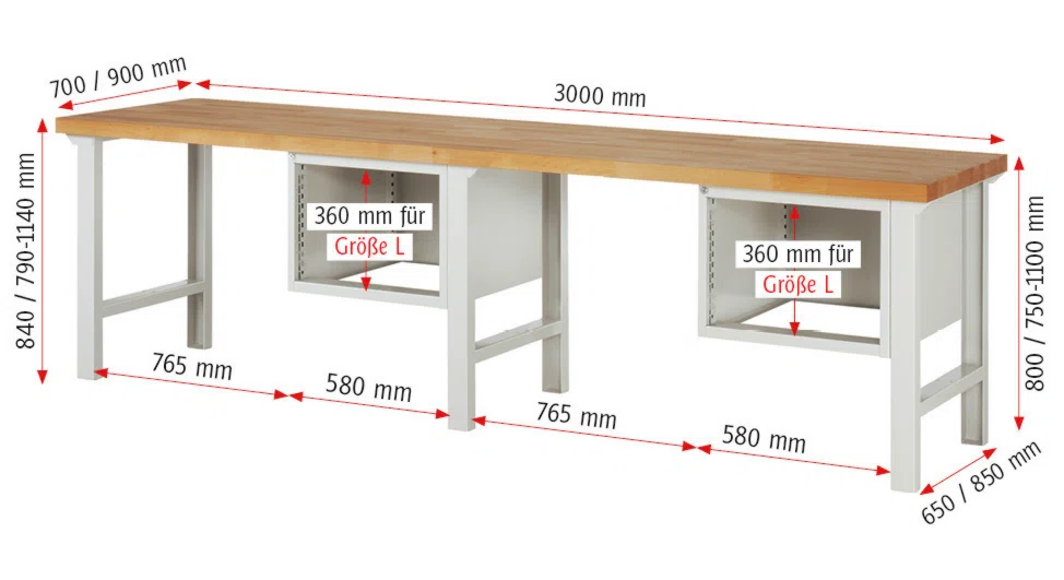 - Maße des Systemunterbaus: B3000 x T650 x H800 mm.