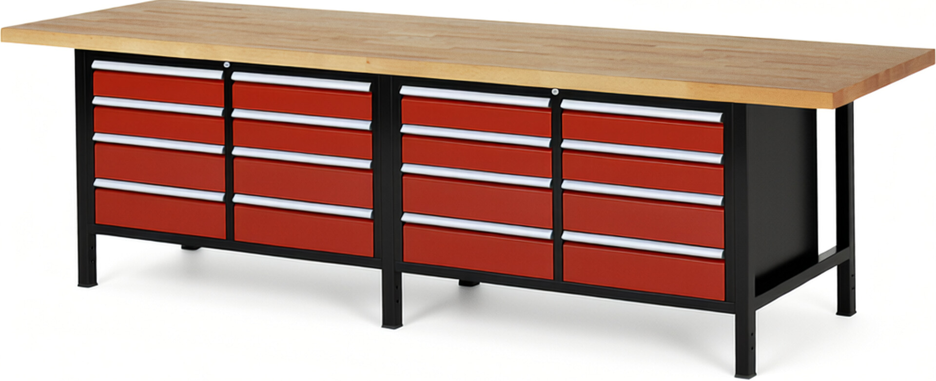 Werkbank Modell 8477 schwarz-rot, BxTxH 3000x900x840-1040 mm, Buche-Massiv Arbeitsplatte 40 mm, 16 Schubladen mit Auszug 90 %