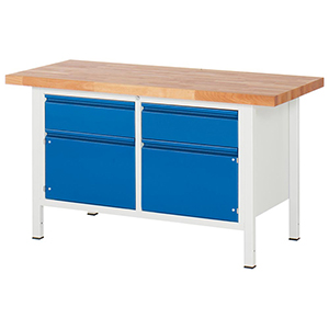 Werkbank schwarz-rot, BxTxH 1500x700x840 mm, Platte Buche 40 mm mit Deckfunier, 2 Schubladen 180 mm, 2 Türen 360 mm, RAL 9011/3000