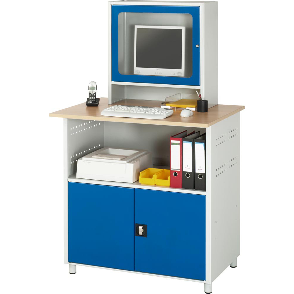 Produktinformationen "PC Schrank, EDV-Schrank, Buche-Dekor-Platte 25 mm stark, stationär, links 1 Fach, rechts 2 Fächer, mit Monitorgeh. T 300 mm, BxTxH 1100x800x1100 mm, RAL 7035/5010"