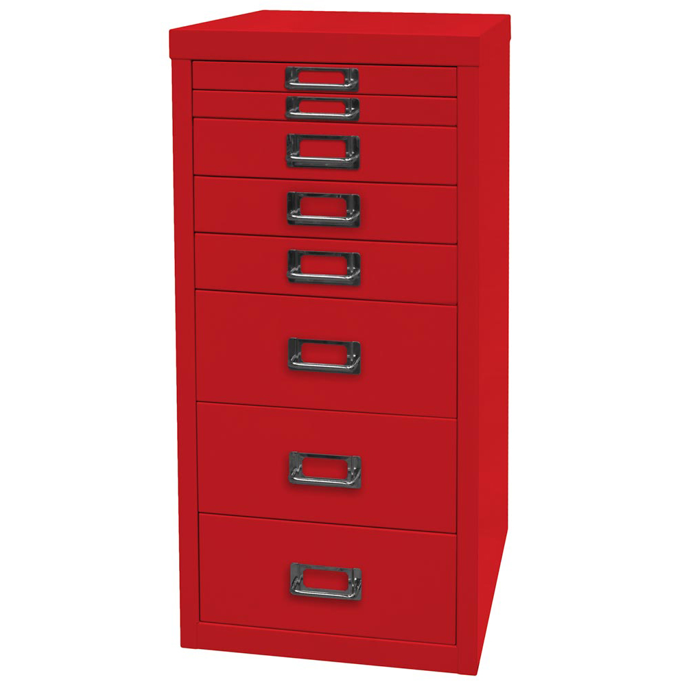 Schubladenschrank aus Stahl, BxTxH 279x380x590 mm, 8 Schubladen 2x25, 3x51, 3x102 mm, DIN A4, kardinalrot