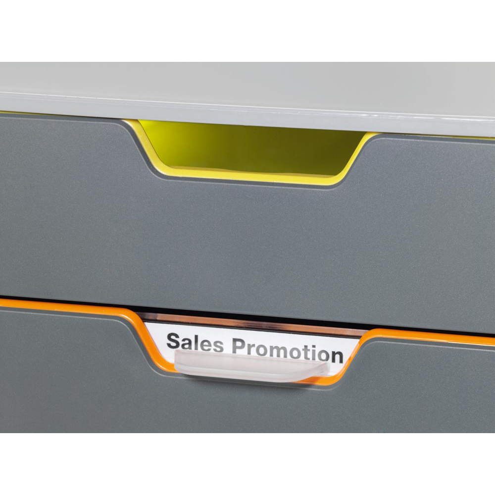 Schubladenboxen · Aus hochwertigem Kunststoff (ABS) · Schubladen in unterschiedlichen Farben, Korpus grau/anthrazit · Für Formate DIN A4, C4 sowie Folio- und Letter-Size-Format · Geräuscharmer Schubladenleichtlauf mit Auszugssperre · Stapelbar · Rutschfeste Kunststofffüße · Inkl. transparenten Beschriftungsfenstern und computerbeschriftbaren, leicht auswechselbaren Einsteck-Etiketten