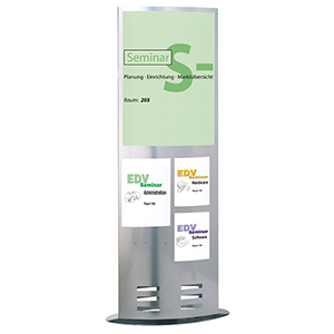 · Pulverbeschichtet RAL 9006 alusilber · Er ist beidseitig nutzbar und mit Plakattaschen und/oder Prospektfächern ausrüstbar · Die Prospektfächer werden in kleine, fast unsichtbare Löcher gesteckt, welche in einem Höhenraster von 165 mm gestanzt sind · Die Plakattaschen bestehen aus Kunststoff in Kristallglas-Optik und haften mit beigefügten Magnetstreifen · Plakate und Schriftstücke lassen sich in Sekundenschnelle wechseln