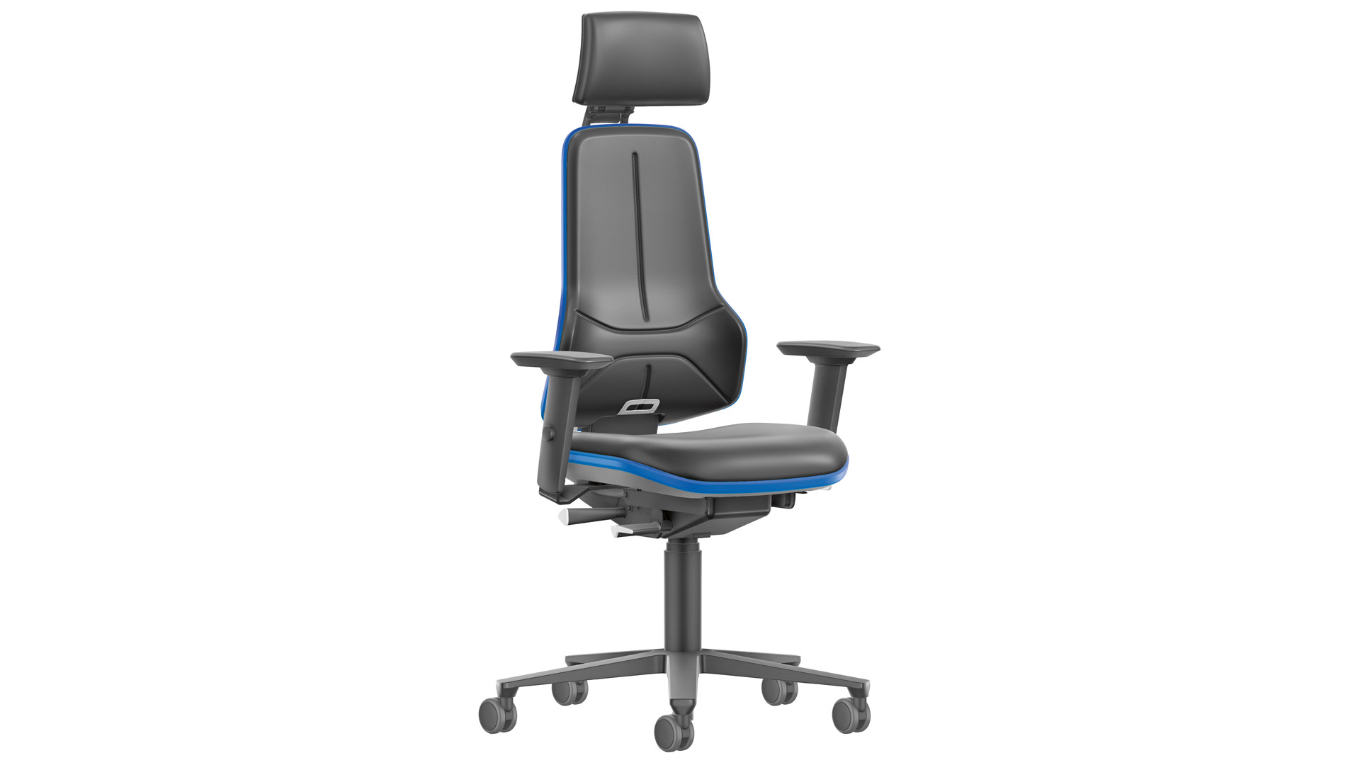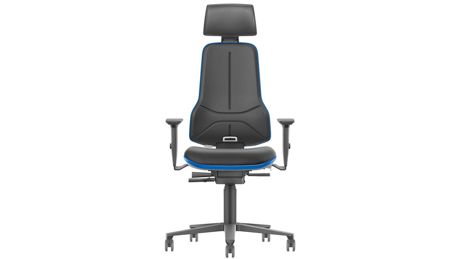 · Gefertigt nach DIN 68877 · Robuste und sichere Bauweise · Schwerlastbauteile: Gestell, Rollen, Mechanik, Gasdruckfeder, Fußkreuz und Polster · XXL - Gewichtsregulierung von 80 bis 180 kg · Schwerlast - Armlehnen mit größerer Breite · Sitztiefenverstellung · Rückenlehnenhöhenverstellung · Fußkreuz aus Aluminium · Neigbare und höhenverstellbare Kopfstütze · Flexbandfarbe in blau · Ergonomisch geformte Sitzfläche und Rückenlehne