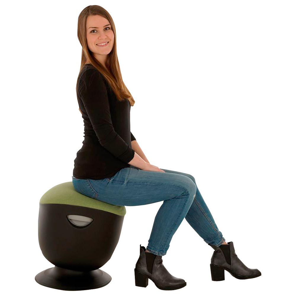 • Höhenverstellung mittels abgedeckter Sicherheitsgasfeder (seitlich am Hocker) • Patentierte wellenförmige Neigungsverstellung • Schwingt in alle Richtungen mit, passt sich der Körperhaltung optimal an • Dynamisches Sitzen, aufgrund einer wellenförmig um das Fußgelenk schwenkenden Neigung • Schwarzer Kunststoff Tellerfuß mit rutschfesten Pads unter dem Fuß • grünes Sitzpolster