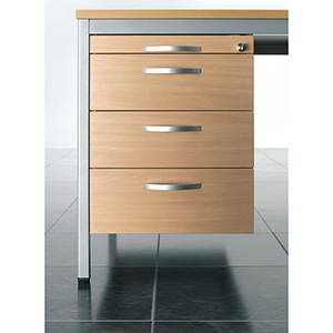 ∙ Vormontiert ∙ Melaminharzbeschichtete E-1-Spanplatten, 19 mm stark, mit 2 mm ABS-Umleimer, Radius 2 mm gerundet ∙ Stahlschubfächer auf Kugelführung mit Einzelauszugssperre, Zentralverschluss und Zylinderschloss ∙ Metallgriffe ∙ Ausgestattet mit 1 Utensilienschub (25 mm hoch, 2/3 ausziehbar) und 3 Schubladen (130 mm hoch, 5/6 ausziehbar)