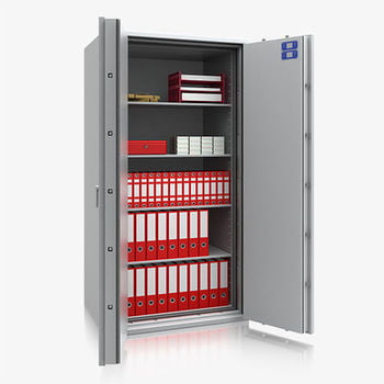 Der Sicherheitsschrank ist ausgestattet mit 100 mm starken Türen mit einer Bolzenverriegelung und einem Doppelbart-Sicherheitschloss.