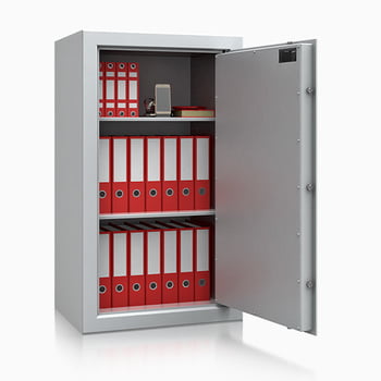 Merkmale:· Massiver Aktentresor· Hochwertige Feuerisolierung mit umlaufender Feuerfalz· Allseitig doppelwandiger Korpus· Tür doppelwandig 78 mm mit vierseitiger Verriegelung· Schließbolzen mit 25 mm Durchmesser· Bolzenverriegelung und Doppelbart-Sicherheitsschloss mit 2 Schlüsseln· Beschläge 60 mm vorstehend· Zur Wandverankerung vorgesehenEigenschaften:· Abmessungen: 1.000 x 700 x 500 mm (HxBxT)· Innenmaße: 880 x 568 x 371 mm (HxBxT)· Anzahl Fachböden: 2 Stück· Volumen: 185 l· Schließung: Bolzenriegelwerk· Schloss: Doppelbart-Sicherheitsschloss· Farbe: Lichtgrau (RAL 7035)Sicherheitsmerkmale:· Flammengeschützt· Privat und gewerblich bis 2.500 EUR versicherbar· VdS Klasse I (1)· Sicherheitsstufe B, S2Auf Anfrage gegen Aufpreis erhältlich:· Mechanisches Zahlenschloss· Elektronisches Zahlenschloss, auch mit Notöffnung· Innenliegendes Schließfach· Auszugboden· HängeregisterauszugMassiver AktentresorDer Aktentresor, auch als Möbeltresor zum Einbauen nutzbar, ist mit einer Bolzenverriegelung und einem Doppelbart-Sicherheitsschloss ausgestattet. Er besteht aus einem flammengeschützten Korpus und einer doppelwandigen Tür mit umlaufender Feuerfalz.Als zusätzlicher Schutz befinden sich zur Wandmontage 2 Bohrungen an der Rückwand.