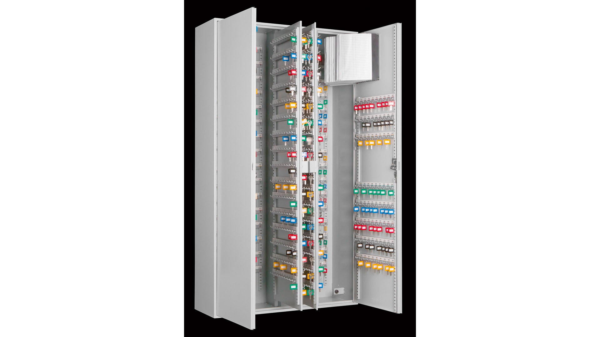 Schlüsselkasten, Schlüsselschrank, zweitürig, Stahlblech, Raster-Hakenleisten, 200 Haken, Zylinderschloss, BxTxH 730x80x550 mm
