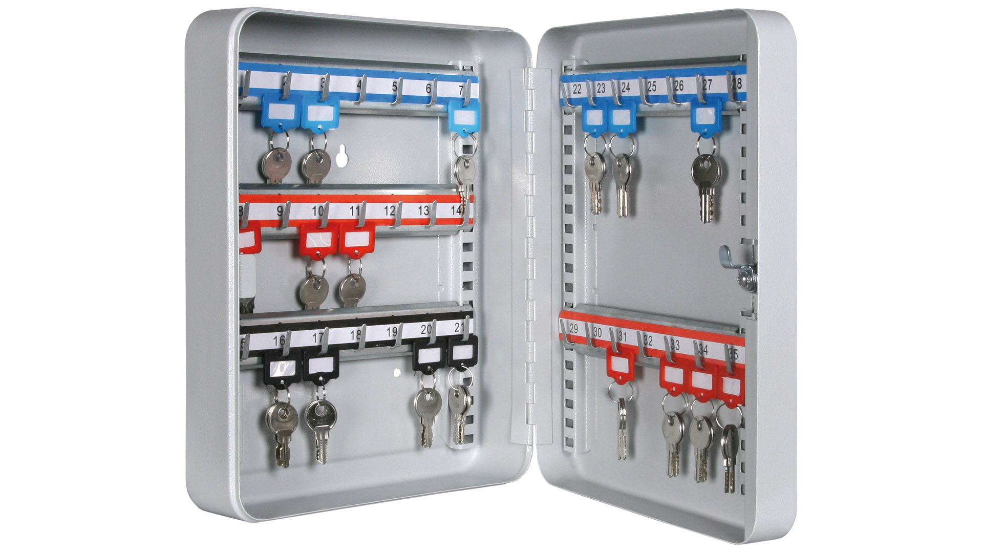 ∙ Gehäuse allseitig einwandig aus Stahlblech ∙ Galvanisch verzinkte Hakenleiste im Rastersystem verstellbar ∙ Zur Wandbestigung vorbereitet ∙ Serienmäßig Zylinderschloß mit 2 Schlüsseln ∙ Farbe RAL 7035 lichtgrau