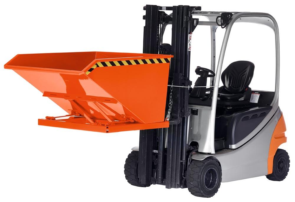 Muldenkippbehälter, Scherenmechanik, Vol. 1,0 cbm, Traglast 1200 kg, BxTxH 1450x1580x780 mm, RAL 2004 reinorange