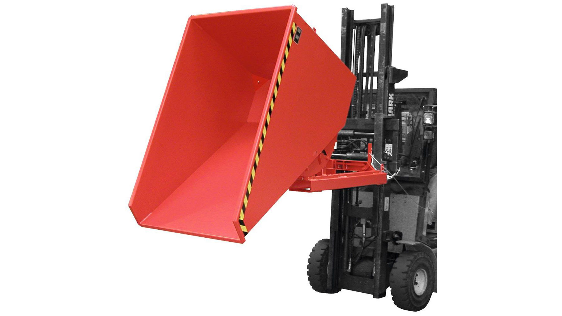 · Robuste Stahlblechkonstruktion, 3 mm Wannenblech mit umlaufend Randprofil · Siebblech und Ablasshahn 1" zum Trennen der Flüssigkeiten von Feststoffen · Öl- und wasserdicht · Günstiger Lastschwerpunkt · Kippen in jeder Höhe per Seilzug vom Staplersitz aus · Nach erfolgter Entleerung schwenkt der Behälter selbstständig in die Ladestellung zurück · Stabiler Grundrahmen mit Einfahrtaschen · Sicherung gegen Abrutschen und unbeabsichtigtes Auskippen