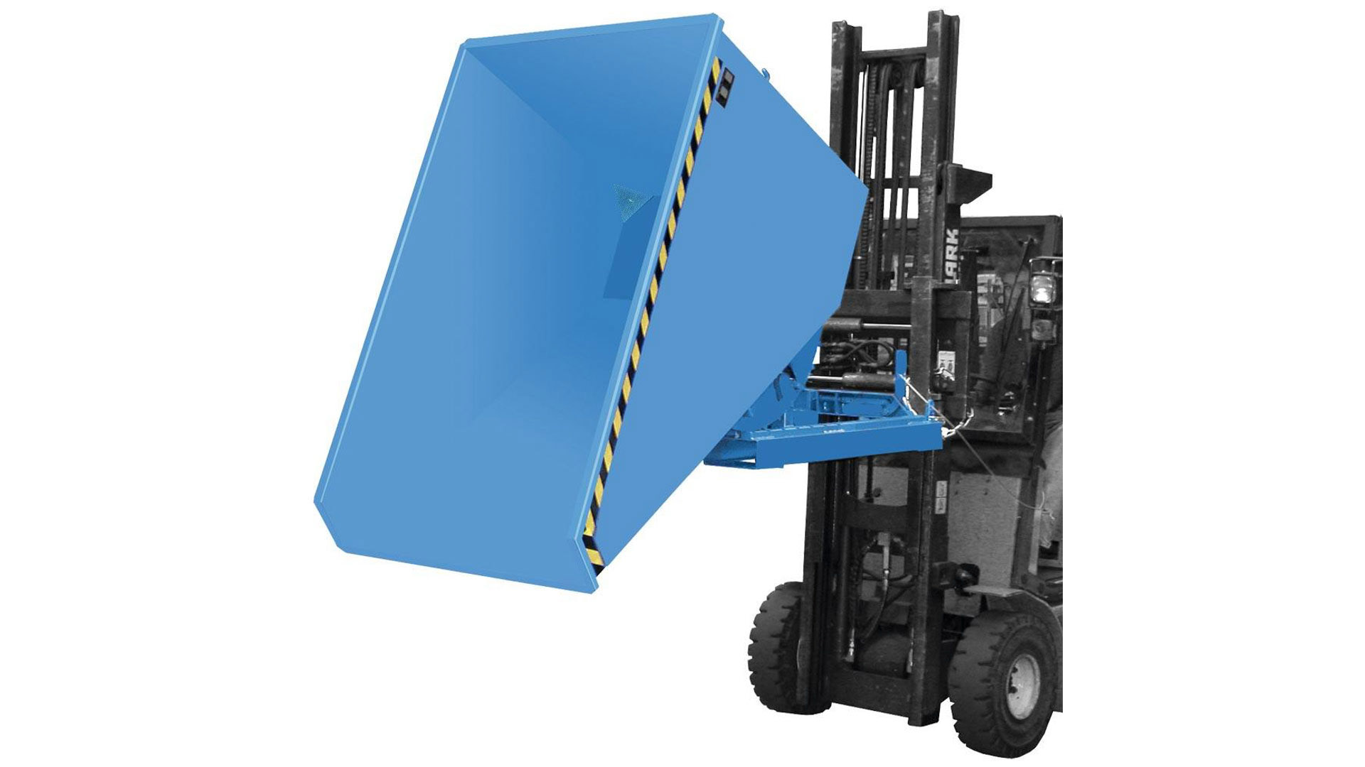 · Robuste Stahlblechkonstruktion, 3 mm Wannenblech mit umlaufend Randprofil · Siebblech und Ablasshahn 1" zum Trennen der Flüssigkeiten von Feststoffen · Öl- und wasserdicht · Günstiger Lastschwerpunkt · Kippen in jeder Höhe per Seilzug vom Staplersitz aus · Nach erfolgter Entleerung schwenkt der Behälter selbstständig in die Ladestellung zurück · Stabiler Grundrahmen mit Einfahrtaschen · Sicherung gegen Abrutschen und unbeabsichtigtes Auskippen