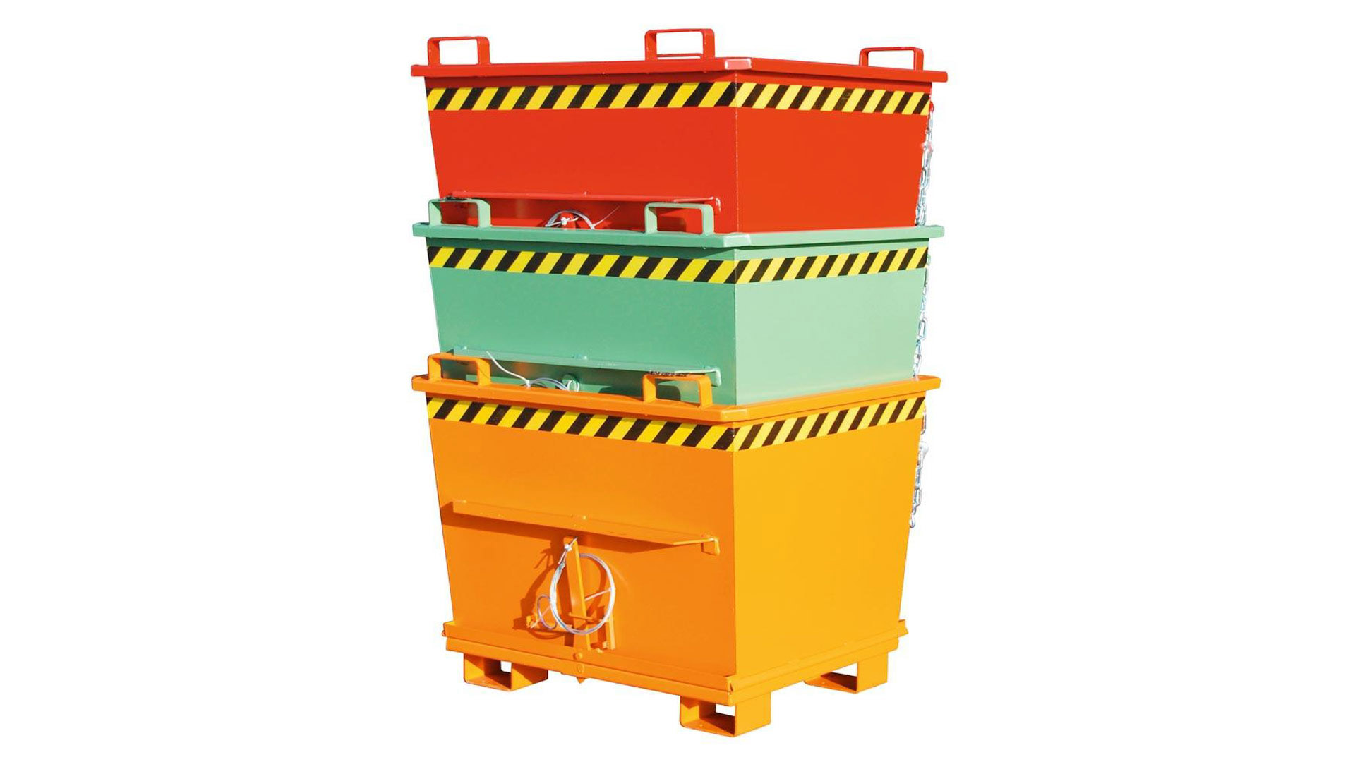 Eigenschaften:· Robuste Stahlblechkonstruktion, lackiert in Gelborange (RAL 2000)· Mit umlaufendem Randprofil· Wände 3 mm, Bodenklappe 4 mm Materialstärke· Bodenklappe schließt beim Aufsetzen selbsttätig· Entriegelung der Bodenklappe per Seilzug· 90 Grad Öffnungsbereich· Sicherung gegen Abrutschen und unbeabsichtigtes Auskippen· Entspricht dem Behälter links auf der Abbildung