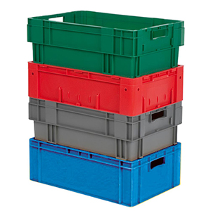 ∙ Aus Polypropylen ∙ Temperaturbeständig von -20 °C bis +90 °C ∙ Entsprechend den Bestimmungen des Lebensmittelgesetzes ∙ Im gefüllten Zustand aufeinander, im Leerzustand platzsparend ineinander stapelbar ∙ Aussparung an Deckel und Kasten für Umreifungsbänder ∙ Halterung für Etiketten auf 2 Seiten ∙ Beständig gegen Öle, Benzin und gegen die meisten Säuren und Laugen ∙ Palettenfähig und Rollenbahngängig