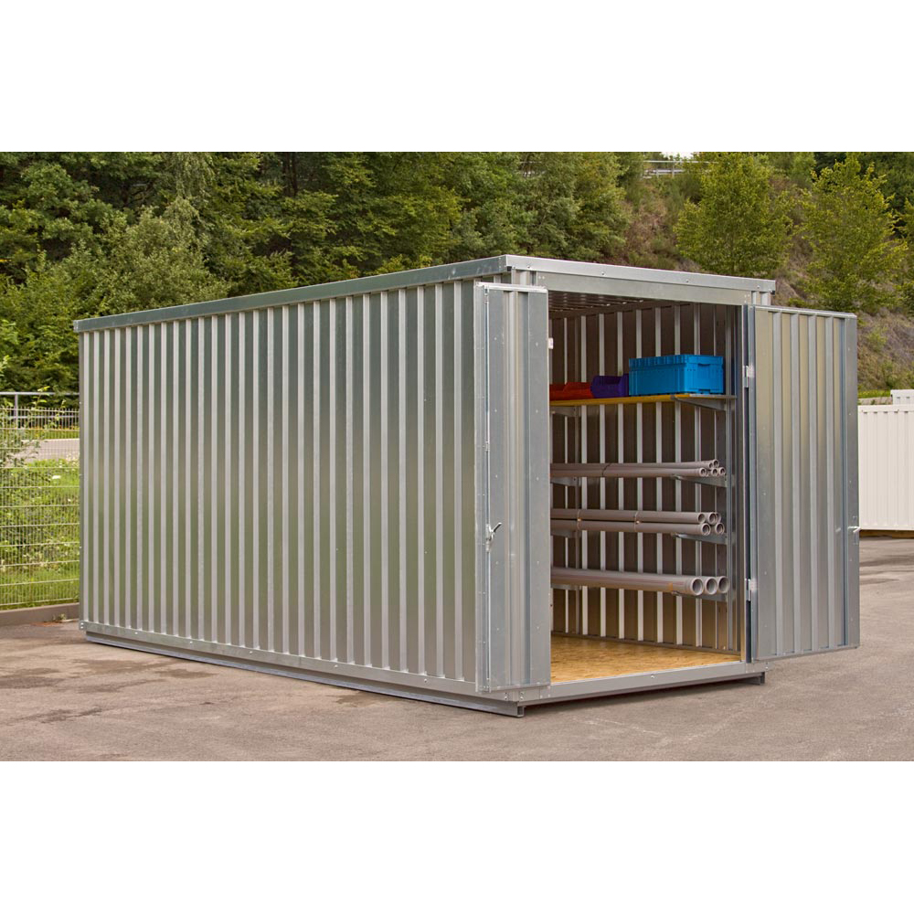∙ Wände und Dach aus sendzimirverzinktem Trapezstahlblech ∙ Bodenrahmen aus komplett verzinkten Stahlprofilen ∙ Optionale Regale ermöglichen die Nutzung der gesamten Raumhöhe und können jederzeit an die individuellen Anforderungen angepasst werden · CE-Kennzeichung mit Leistungserklärung für Standsicherheitsnachweis nach Eurocode 3