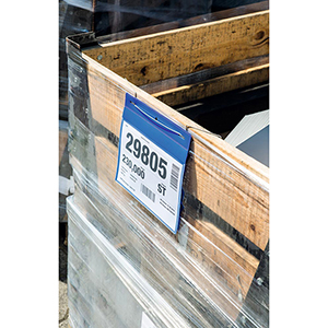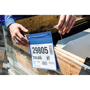 Drahtbügeltaschen · Mit flexiblem, verzinkten Draht für eine leichte und sichere Befestigung · Für den Einsatz an Transportbehältern, Palettenkartons, Holzaufsatzrahmen und Gitterboxen · Scannertauglich und dokumentenecht · Blaue Rückenfolie und transparente Vorderfolie aus transparentem Polypropylen · Geeignet für den Außeneinsatz durch Staub- und Regenschutzklappe · Schneller Austausch der Einsteckschilder · VE 50 Stück