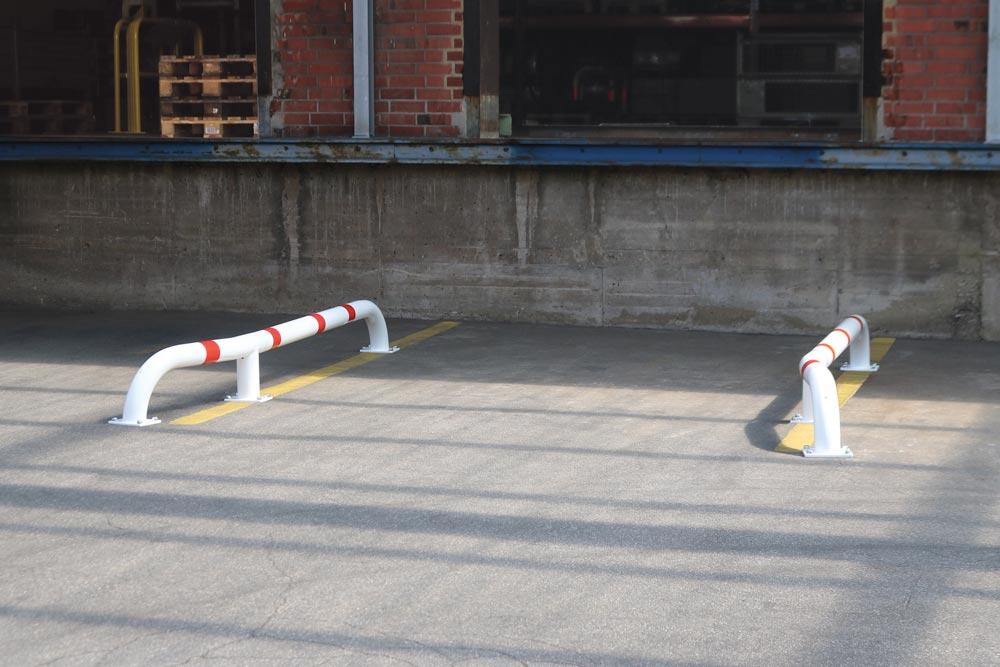 LKW-Einfahrhilfen-Set, feuerverzinkt und beschichtet in RAL 9016, rote Streifen, Länge 2800 mm, Höhe 280 mm, D 108 mm