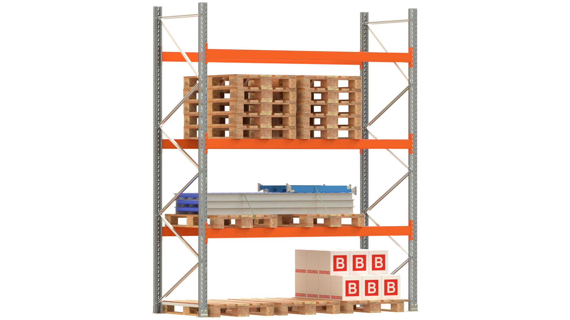Palettenregal ARTUS - Breite 287 cm - Höhe 350 cm - Tiefe 110 cm - 3 Träger-Ebenen - Fachlast 2000 kg - 12 Palettenstellplätze