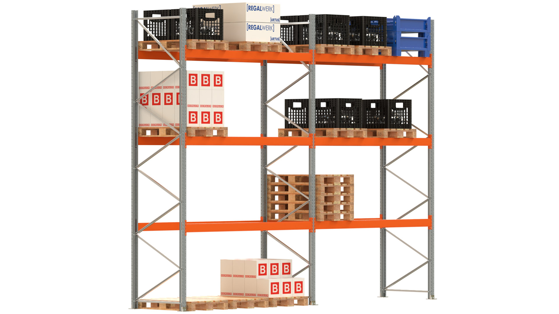 Palettenregal ARTUS - Breite 565,5 cm - Höhe 450 cm - Tiefe 110 cm - 3 Träger-Ebenen - Fachlast 2910 kg - 24 Palettenstellplätze